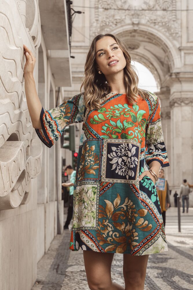 Orientique polvimittainen värikäs kesämekko, jossa pyöreä pääntie ja vajaamittaiset hihat. Mekossa on kaunis lämpimän sävyinen kuviointi. Hihansuissa alaspäin levenevät frillat. Mekko on kevyesti a-linjainen, alaspäin levenevä malli jossa sivusaumoissa taskut. Pituus olalta helmaan 95 cm, koossa 36.