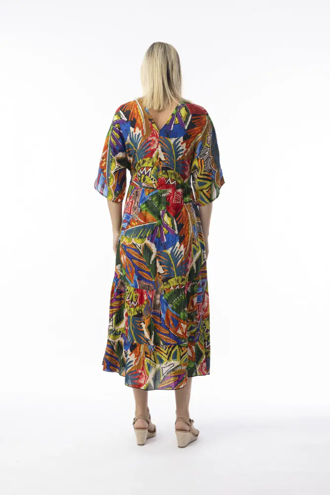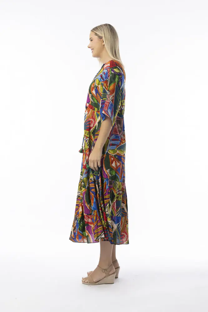 Orientique pitkä kesämekko näyttävällä mausteisen sävyisellä kuosilla. Mekossa on väljähkö yläosa kimonomallisella hihalla. V-mallisen pääntien reunaa kiertää edessä kuviollinen nauha hapsureunuksella. Pääntie on myös takaa v-mallinen. Vyötäröllä edestä kaareva nauhakuja jossa solmittava nyöri helmikoristeisilla tupsuilla. Nyörillä väljälinjaisen mekon voi säätää vyötäröltä istuvaksi. Alaspäin levenevä helmaosa jossa alhaalla kaksi poimutettua kaitaletta. Mekon materiaali kaunista himmekiiltoista rayonia. Pituus olalta helmaan 130 cm, koossa 36.