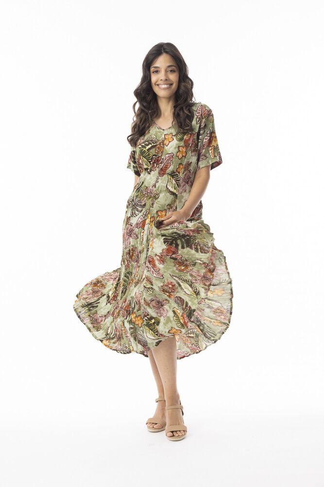Orientiquelta vaaleanvihreä kuviollinen lyhythihainen kesämekko, jossa siron mallinen v-pääntie. Kevyt hyvin laskeutuva rypytetty materiaali. Ryppyefektin voi säilyttää kiertämällä mekko kierteelle pesun jälkeen ja kuivattaa se rullalla. Kevyesti vartaloa myötäilevä malli, jossa taakse tai vyötärölle solmittava nyöri ja kellotettu helmaosa. Pituus olalta 110 cm, koossa 36.